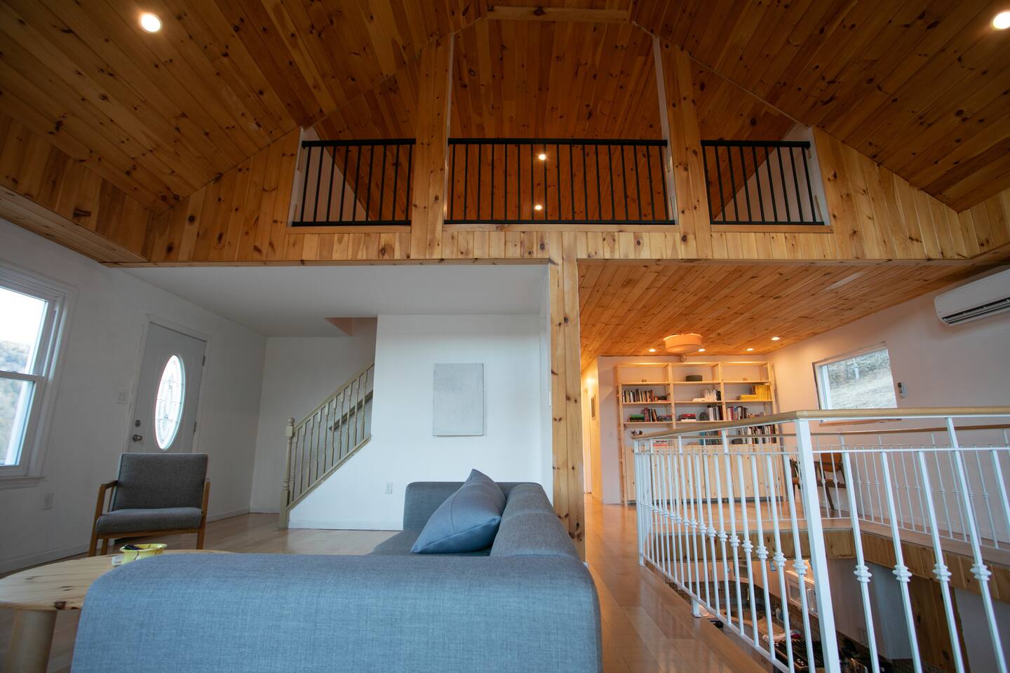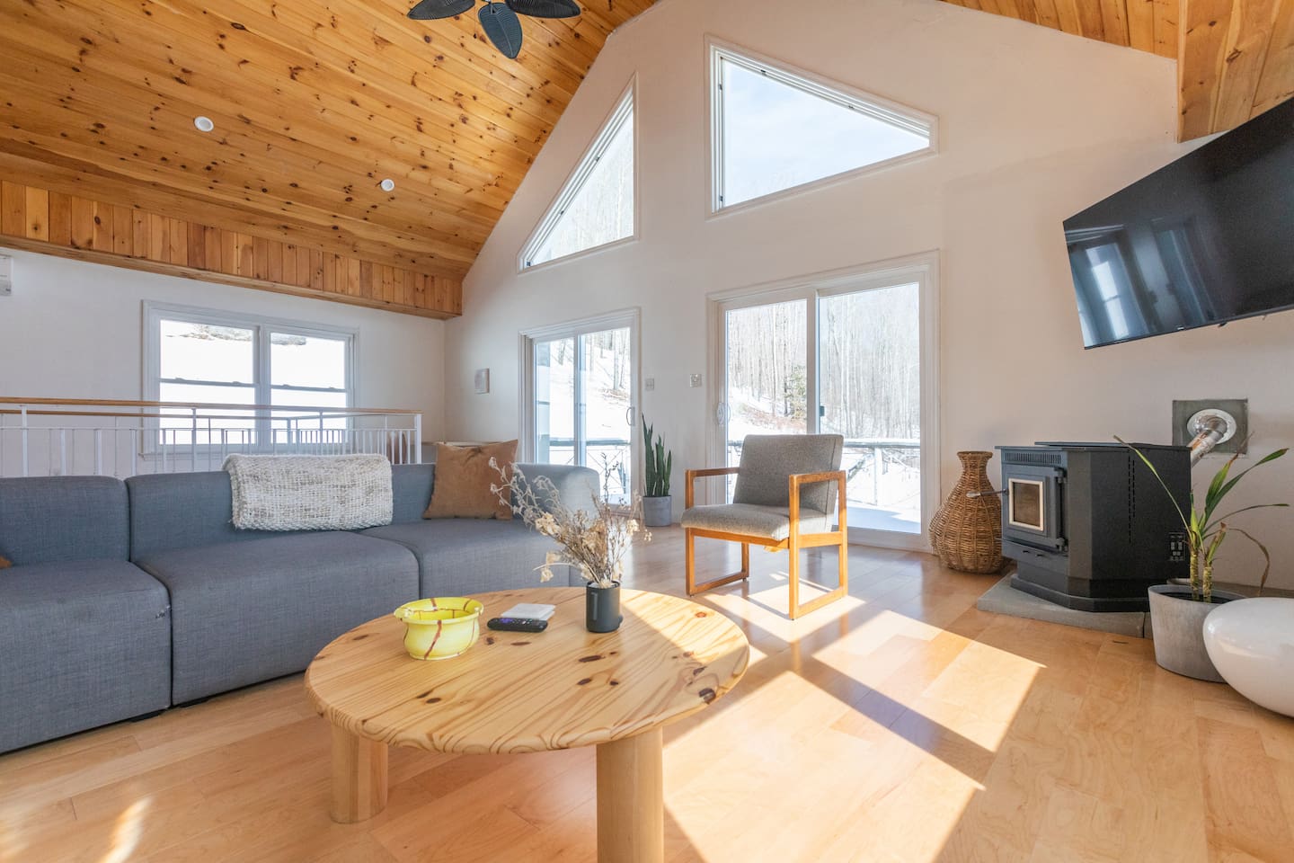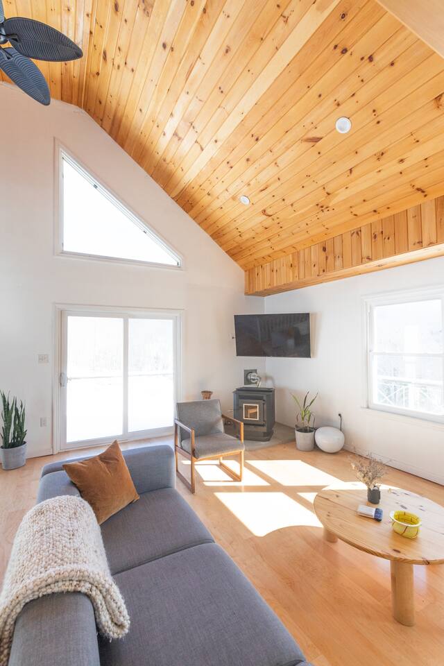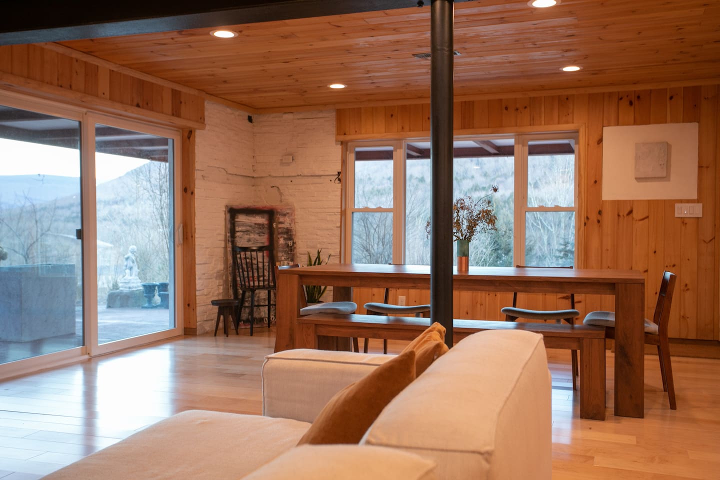 ⛰️ Modern chalet perched on a hill 🏂 10Mins to Belleayre Mountain ☕️ 5Mins to Doolitte's Coffee 🍳Open+well-stocked kitchen 🪵 Wood-burning fireplace 🛋️ Two living room spaces + Large Deck 💫 Stargazing +views of wildlife