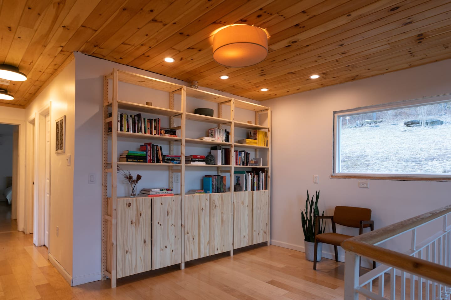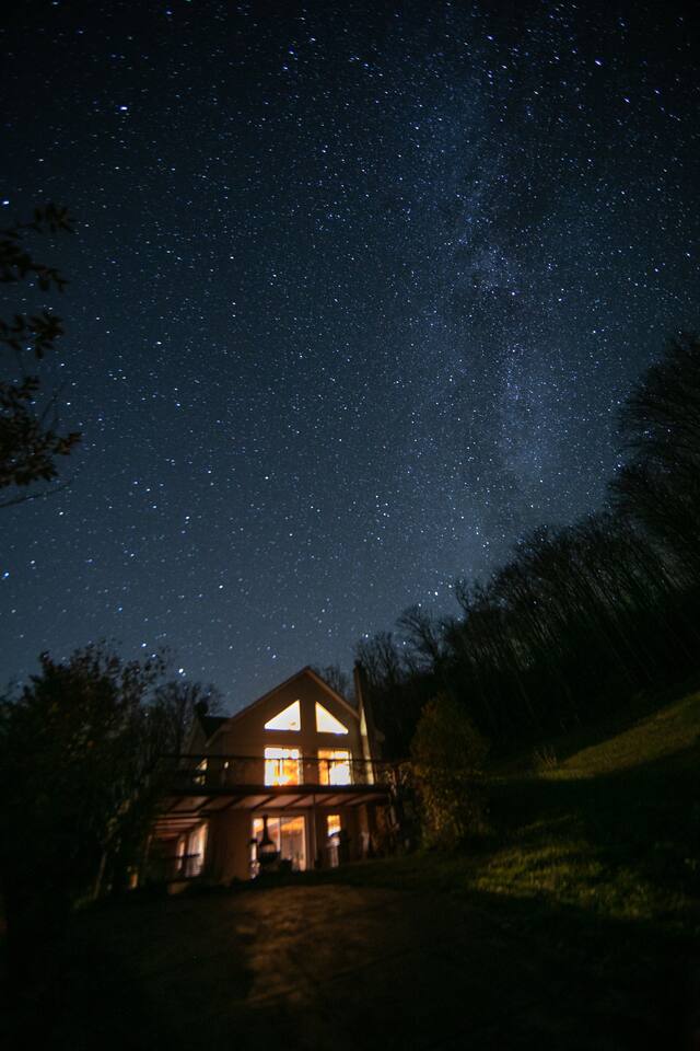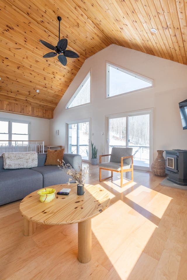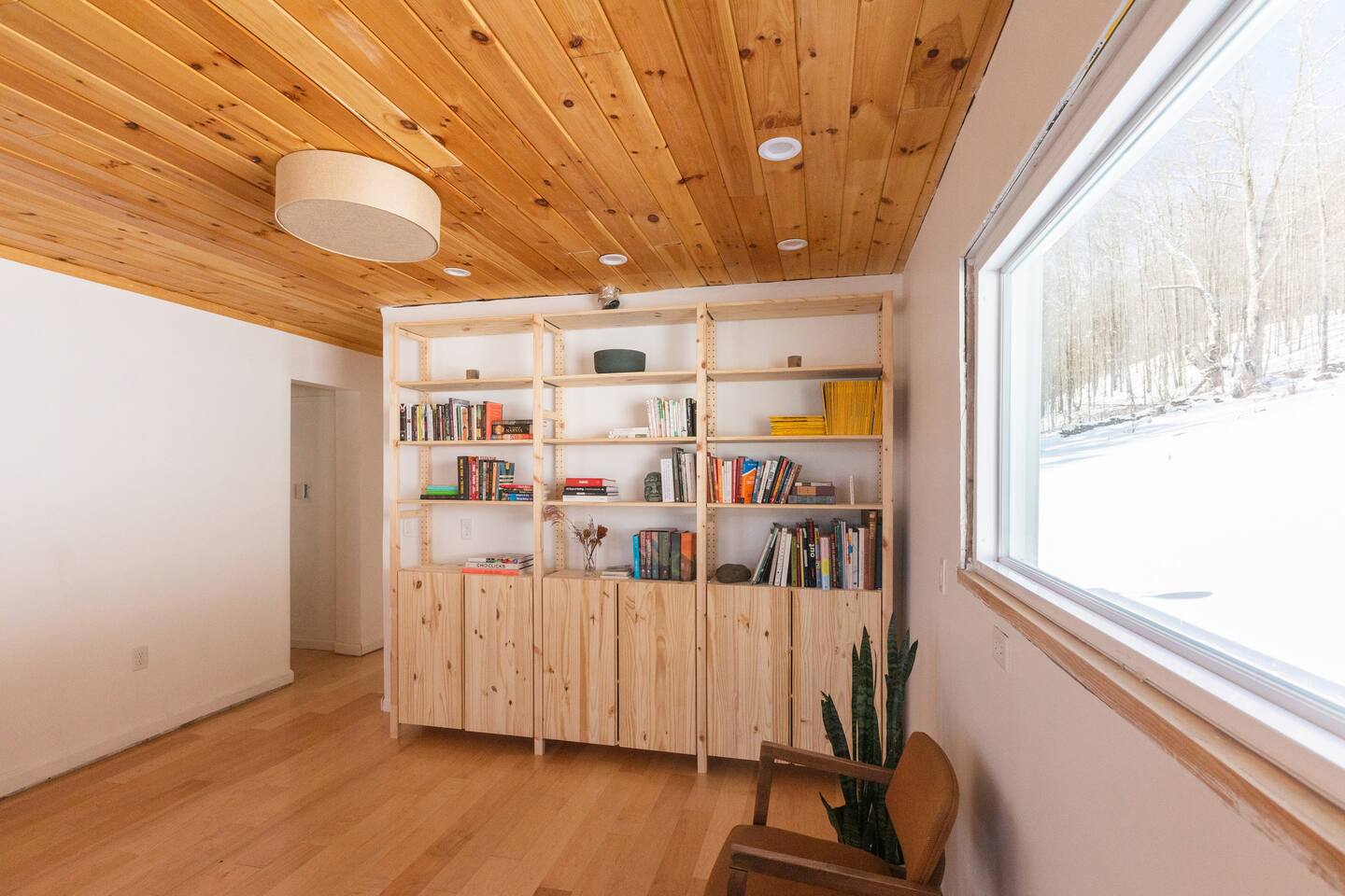 ⛰️ Modern chalet perched on a hill 🏂 10Mins to Belleayre Mountain ☕️ 5Mins to Doolitte's Coffee 🍳Open+well-stocked kitchen 🪵 Wood-burning fireplace 🛋️ Two living room spaces + Large Deck 💫 Stargazing +views of wildlife