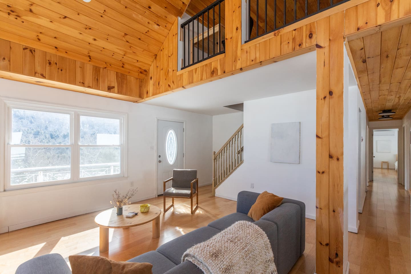*WINTER: Please plan ahead and ensure your vehicle is equipped with 4WD / AWD for winter conditions. It's best to arrive during daylight hours. Our driveway is steep. Without 4WD / AWD, you will not be able to get up the driveway given the snowy/conditions. Please note this is also our family home and not a party house. Treat our home as you would with your home. **We are approximately 2 miles to downtown Fleischmanns. The town is not within walking distance. The road leading to town is steep and winding, and does not have a shoulder. KITCHEN • Fully stocked, pots, pans and butcher block island • Large refrigerator with freezer drawer • Gas stove+oven, cooking tools and utensils • Two barstools • Toaster, microwave, dishwasher, teapot • Coffee maker, coffee bean grinder • Select teas, sugar • Olive oil and select spices DINING: • Beautiful, sleek wood dining table • Comfortable dining for 8 and seating for 10 • Adjacent to living room LIVING ROOM (lower Level) • Wood-burning fireplace with stone finish • Large, comfy sofas for lounging by the fire BEDROOM 1 (first floor) • Queen bed • Sateen sheets; down comforters and linen duvet covers in calming, neutral shades • Closet+dresser, plus nightstands • Floor fan (No AC) BATHROOM 1 (first floor) • Double sink vanity with large mirror • Standing shower BEDROOM 2 (second floor) • Full-size bed • Sateen sheets; down comforters and linen duvet covers in calming, neutral shades • Closet+dresser, plus nightstands • Floor fan (No AC) BEDROOM 3 (second floor) • Full-size bed • Sateen sheets; down comforters and linen duvet covers in calming, neutral shades • Closet+dresser, plus nightstands • Floor fan (No AC) BATHROOM 2 (second floor) • Across from two bedrooms • Large vanity with single sink • Shower and bathtub Bedroom 4 (Primary, second floor) • Queen bed, plus crib • Walk-in closet, large dresser, nightstands • Ensuite bathroom with Jacuzzi bathtub • Air Conditioning BATHROOM 3 (en suite to Primary) • En suite to primary bedroom • Large soaking bathtub with mountain views • Large walk-in standing shower • Double vanity sink and large mirror • Linen closet BEDROOM 5 (THIRD FLOOR LOFT) • Full size bed with work table. • Couch • Desk for flexible work space (There are no doors to access the loft, and is open to the living room below, so please keep this in mind prior to booking.) 1st fl living room has a wood-burning fireplace. The open mezzanine extends full height to the roof for a connected and communal experience. Enjoy your morning coffee and meals on the deck overlooking Halcott Mountain. There's a propane grill on the first floor. High speed fiber internet + WIFI. 55" TV with Roku (you'll need your own account to access your favorite streaming services such Netflix, Hulu, Amazon Prime, HBO, etc... Central heat is controlled by a Nest thermostat and only heats the bedrooms and bathrooms. Living areas heated by split systems. Main bedroom split system only for AC in summer. AC only available in 1st and 2nd fl living rooms and primary bedroom. Every bedroom has a floor fan. Our home is in a rural area with very strict recycling rules. Please follow the recycling guide per the home manual to avoid incurring a fine that will be paid by the guest. We love pets but they are not allowed due to our allergies. *WINTER: Please plan ahead and ensure your vehicle is equipped with 4WD / AWD for winter conditions. It's best to arrive during daylight hours. Our driveway is steep. Without 4WD / AWD, you will not be able to get up the driveway given the snowy/conditions. Please note: any extended stay requests beyond 2 hours will need to be assessed and will require a fee. We do not allow guests who do not have positive reviews. This is our second home and a good track record is important to us to ensure our home will be well taken care of.